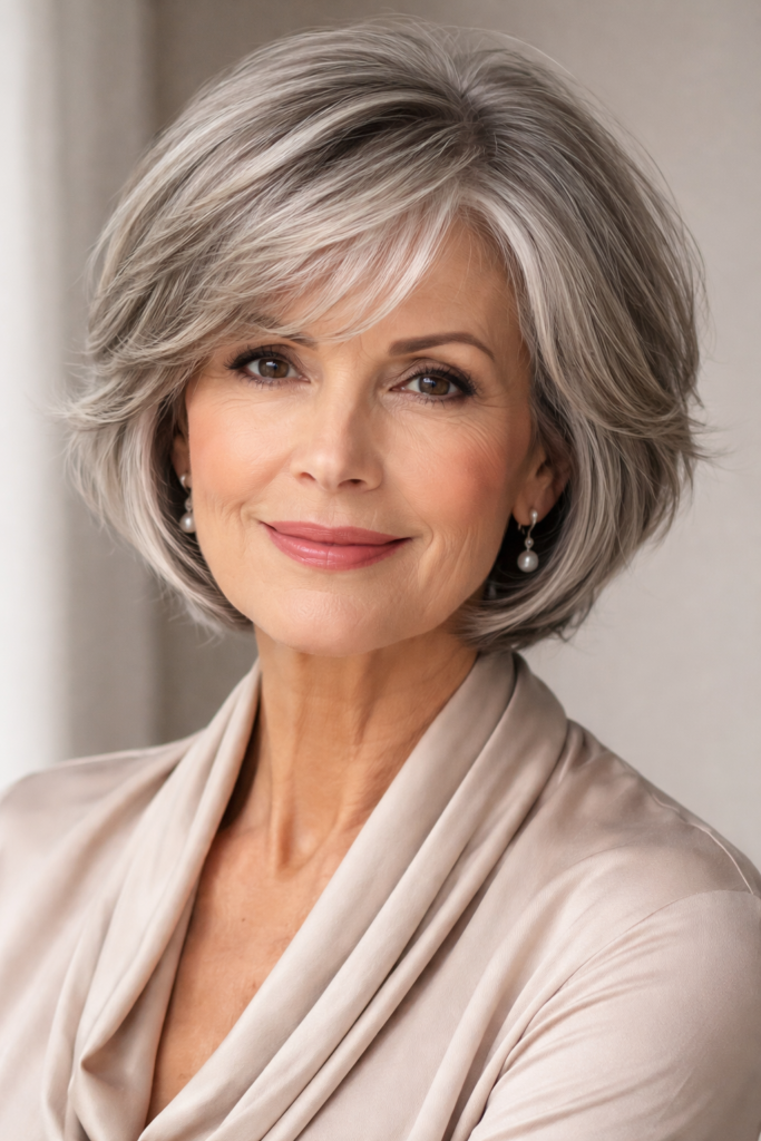 The classic layered bob is a timeless short hairstyle for women over 50 that blends elegance with modern versatility. Soft layers add movement and dimension, making fine hair appear fuller and more voluminous. This style works beautifully with natural gray, silver, or colored hair, enhancing texture while maintaining a polished, youthful appearance perfect for everyday wear or special occasions.