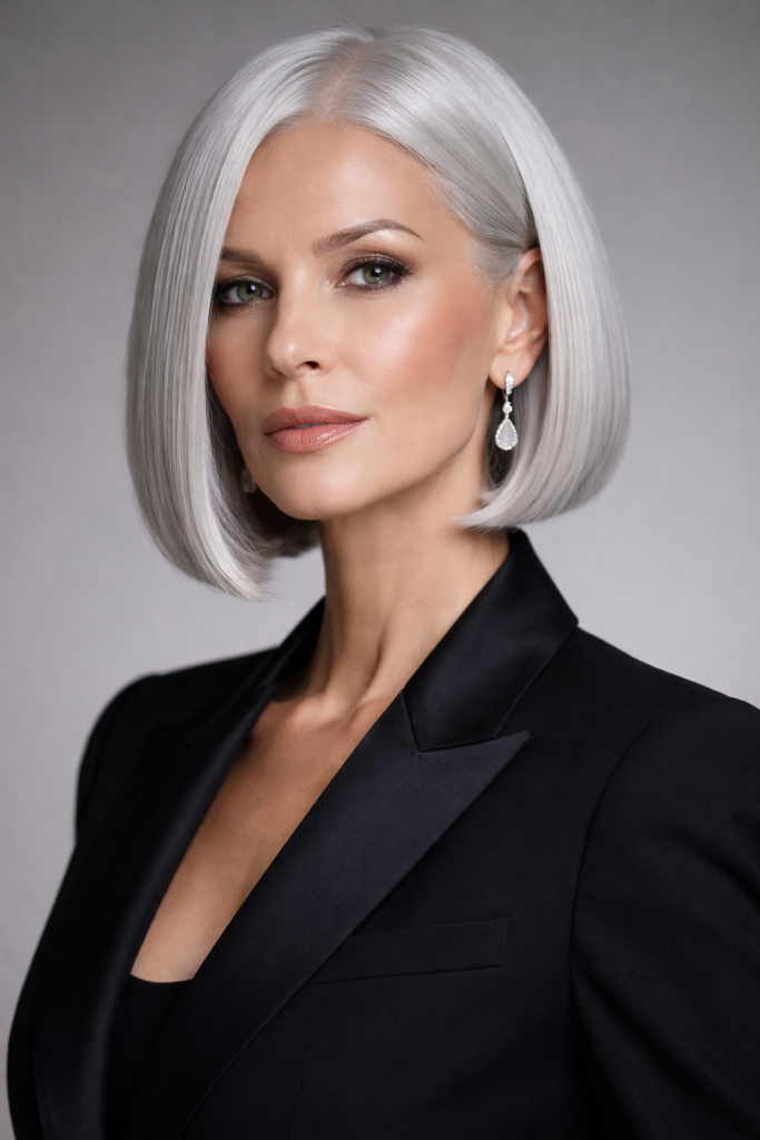 The chin-length blunt bob is a sleek and structured hairstyle that delivers a clean, sophisticated appearance. Its sharp edges create the illusion of thicker, fuller hair, making it ideal for women over 50 with fine or thinning strands. This haircut frames the face beautifully, enhancing jawlines and cheekbones while maintaining a polished, modern vibe that performs exceptionally well on Pinterest.