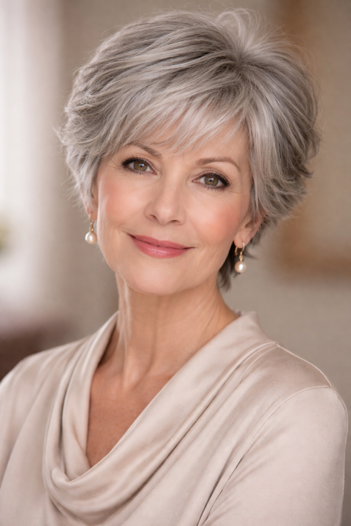Styling is minimal, requiring only light products to maintain volume and shape. It works well with natural gray or softly colored hair, adding depth and dimension. This hairstyle is ideal for Pinterest audiences seeking simple, elegant, and easy-to-maintain looks.