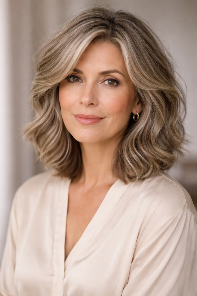 A layered lob offers the perfect balance between short and medium length. It provides volume, movement, and versatility, making it ideal for women over 50. The layers prevent the hair from looking flat and lifeless.