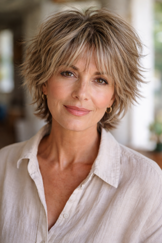 The short shag cut is a trendy, layered hairstyle that adds texture and volume effortlessly. Perfect for women over 50, it gives a youthful, carefree vibe while maintaining sophistication. The layers create movement, making it ideal for thinning hair.