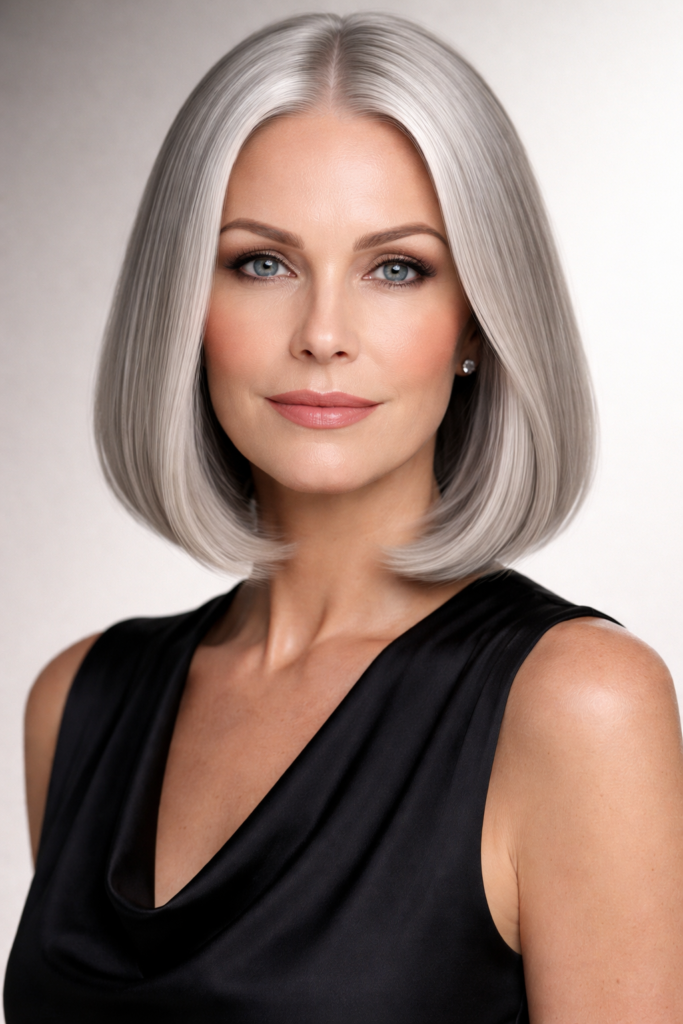 Flat ironing and shine serums enhance the glossy finish, giving a salon-like appearance. It pairs perfectly with silver, platinum, or dark tones, adding sophistication. This style is highly Pinterest-worthy due to its simplicity, elegance, and timeless appeal that never goes out of fashion.