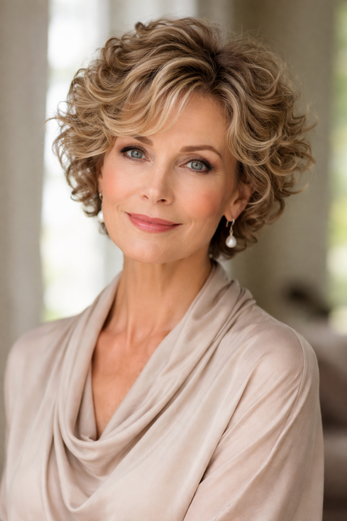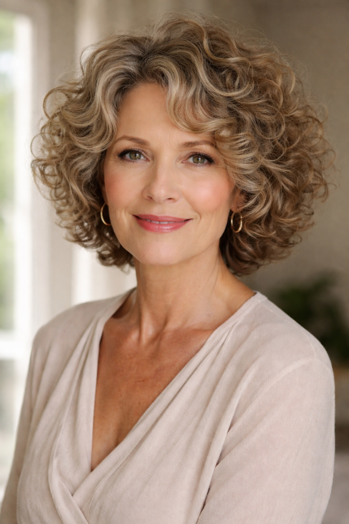 Short layered curls are perfect for embracing natural texture while adding structure and volume. This hairstyle allows curls to fall naturally while layers prevent heaviness, creating a balanced and airy look. For women over 50, it provides a youthful and vibrant appearance while maintaining elegance and softness that performs well across Pinterest content.