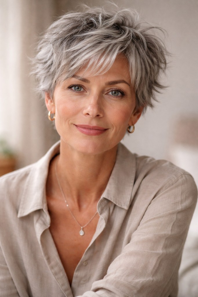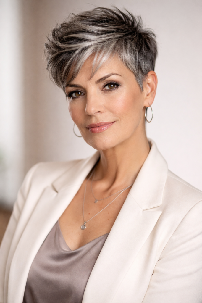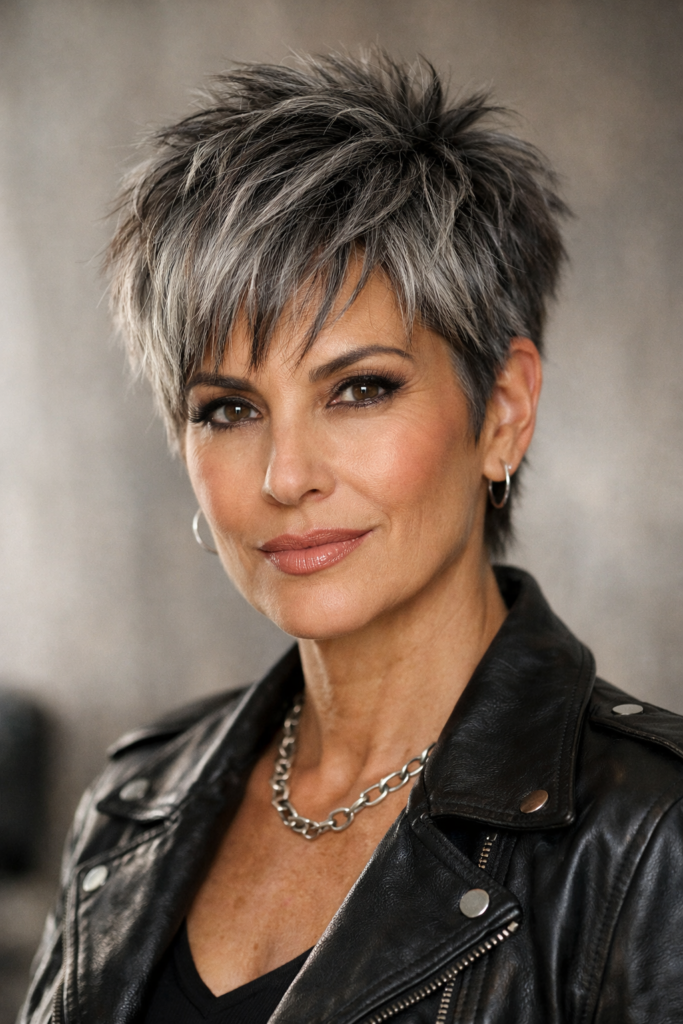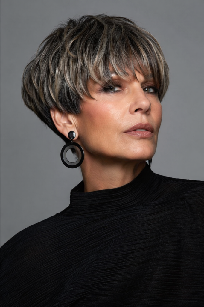 Styling is effortless just a bit of texturizing spray or mousse can enhance definition. It’s perfect for women who prefer low-maintenance hair without compromising style. This haircut works especially well with gray or salt-and-pepper tones, adding a trendy, edgy vibe while maintaining sophistication and elegance.