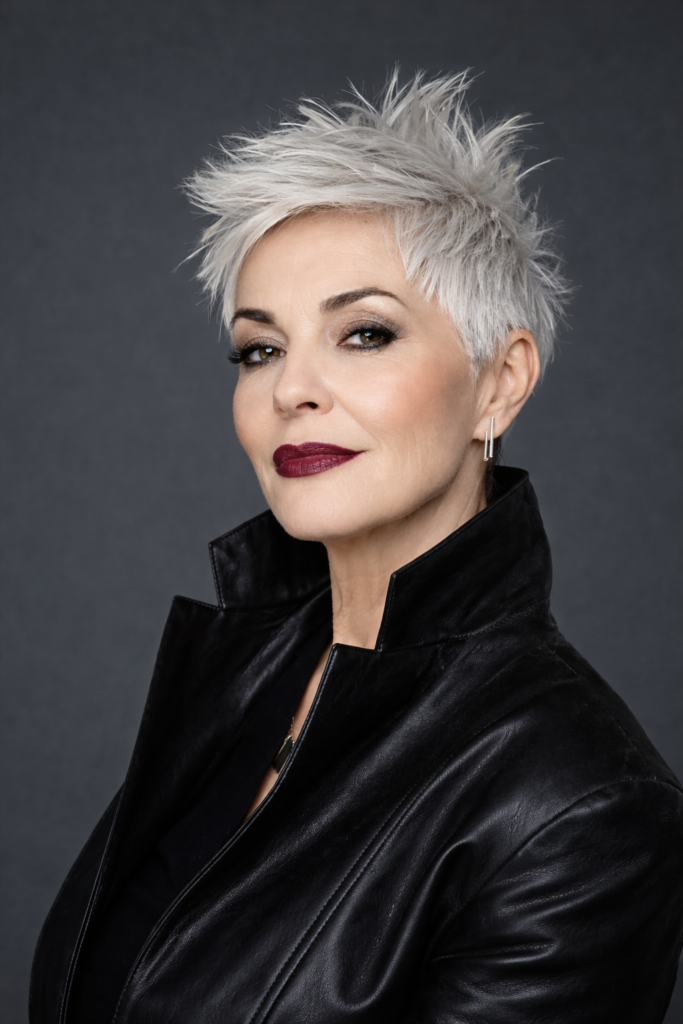 The short spiky pixie is a fun and edgy hairstyle that adds personality and confidence. The spiky texture creates volume and dimension, making it a great choice for women over 50 who want a bold and youthful appearance. It’s a standout look that performs well on visually driven platforms like Pinterest.