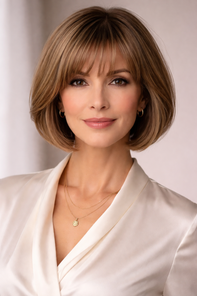 A short bob with bangs creates a fresh and youthful appearance by framing the face and softening features. This hairstyle is ideal for women over 50 who want to conceal fine lines on the forehead while adding a trendy, modern touch. The combination of bangs and a structured bob creates a balanced and stylish look.