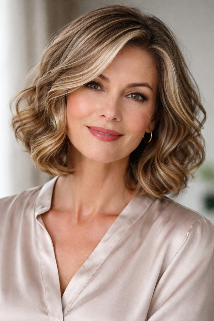 The wavy bob with a side part is a flattering and feminine hairstyle that adds volume and movement effortlessly. Soft waves create a relaxed yet polished appearance, making it perfect for women over 50 who want a youthful and modern look. The side part adds asymmetry, enhancing facial features and creating a natural lift that looks great in Pinterest visuals.