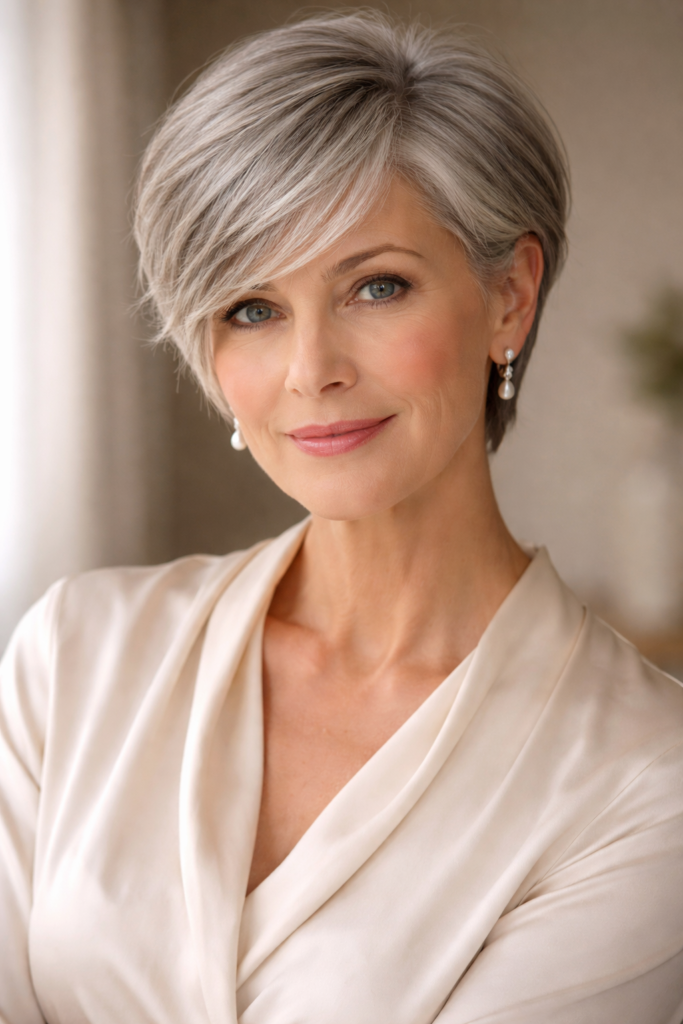 The side-swept pixie cut is a soft and elegant variation of the classic pixie, featuring longer bangs swept gently to one side. This adds movement and frames the face beautifully, making it an excellent choice for women over 50 who want a flattering, youthful hairstyle that still feels sophisticated and modern.